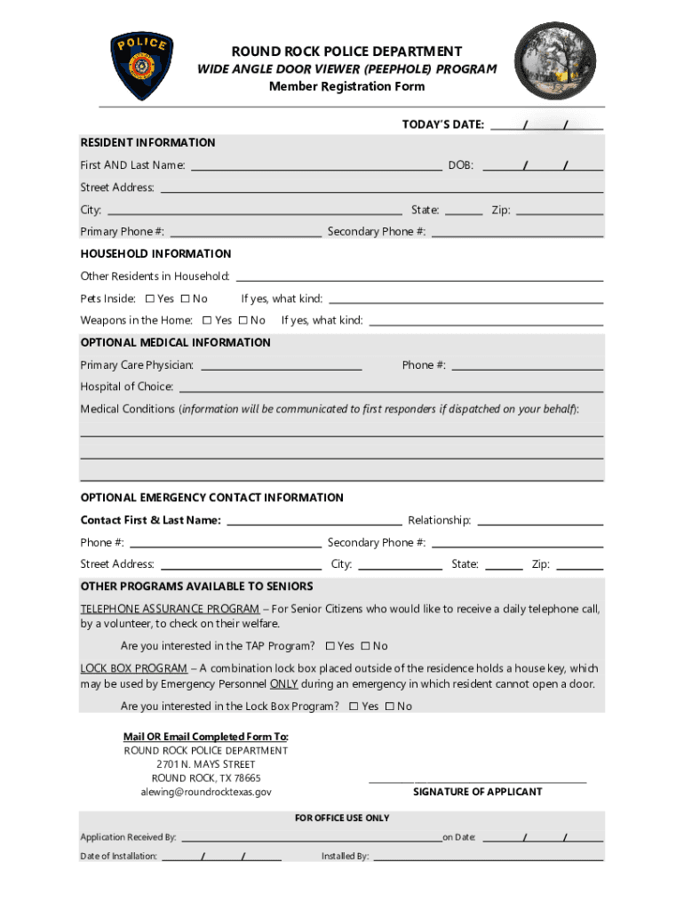 ROUND ROCK POLICE DEPARTMENTALIZE ANGLE DOOR VIEWER (PEEPHOLE) PROGRAM Member Registration Form TODAYS DATE:////RESIDENT INFORMATION First AND Last Name:DOB:Street Address: City:State:Primary Phone
