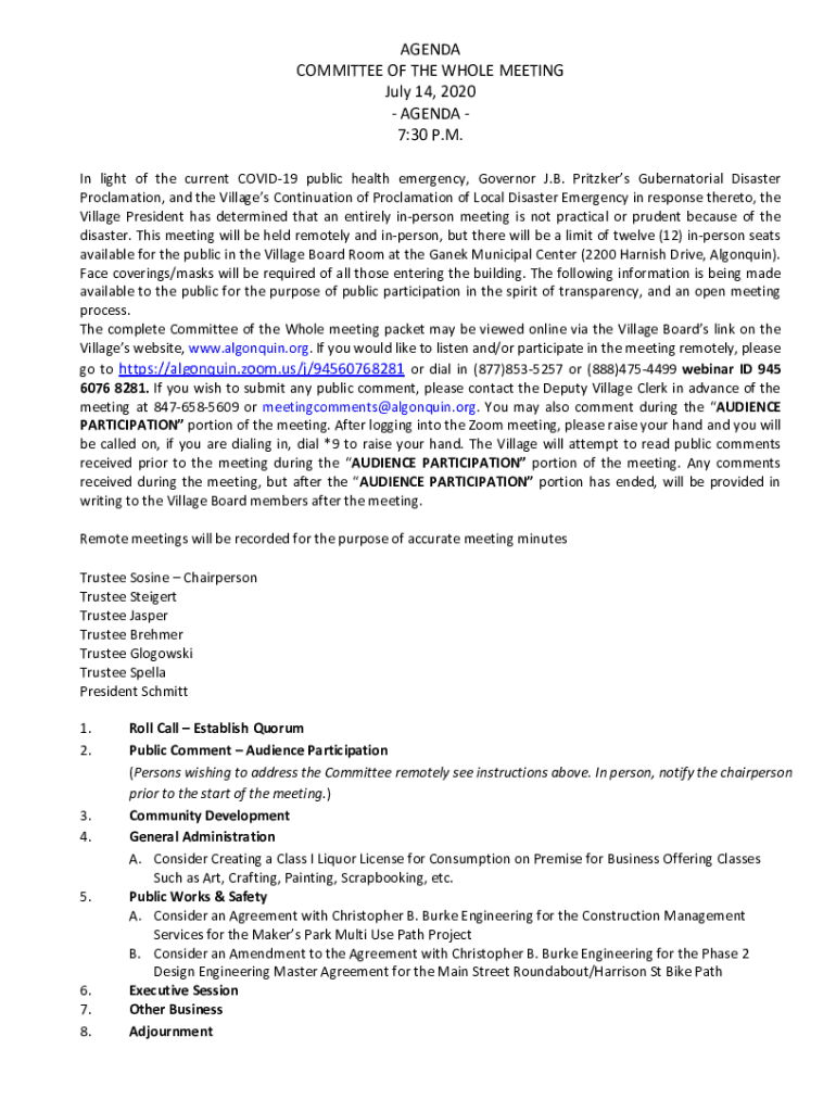 AGENDA COMMITTEE OF THE WHOLE MEETING July 14, 2020, AGENDA 7:30 P.M. In light of the current COVID-19 public health emergency, Governor J.B. Pritzker Gubernatorial Disaster Proclamation, and the