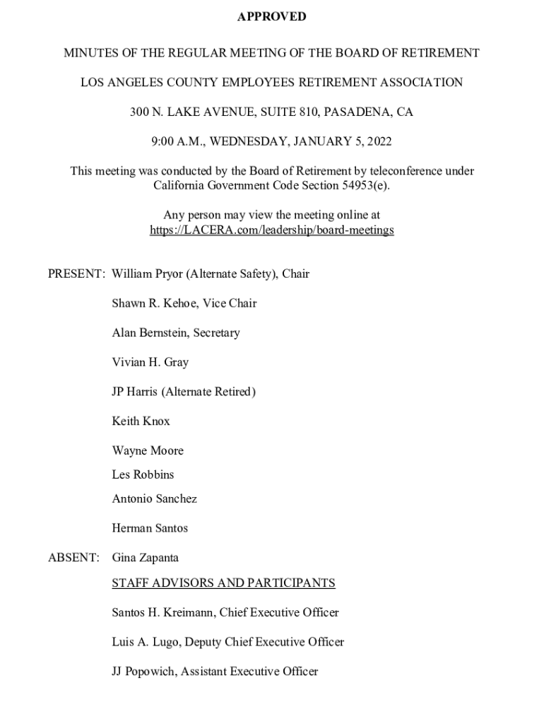 APPROVED MINUTES OF THE REGULAR MEETING OF THE BOARD OF RETIREMENT LOS ANGELES COUNTY EMPLOYEES RETIREMENT ASSOCIATION 300 N. LAKE AVENUE, SUITE 810, PASADENA, CA 9:00 A.M., WEDNESDAY, JANUARY 5,