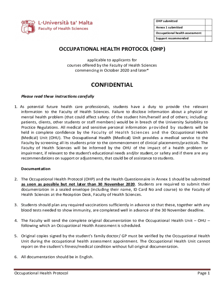 HP submitted Annex 1 submitted Occupational health assessment Support recommendedOCCUPATIONAL HEALTH PROTOCOL (HP) applicable to applicants for courses offered by the Faculty of Health Sciences commencing