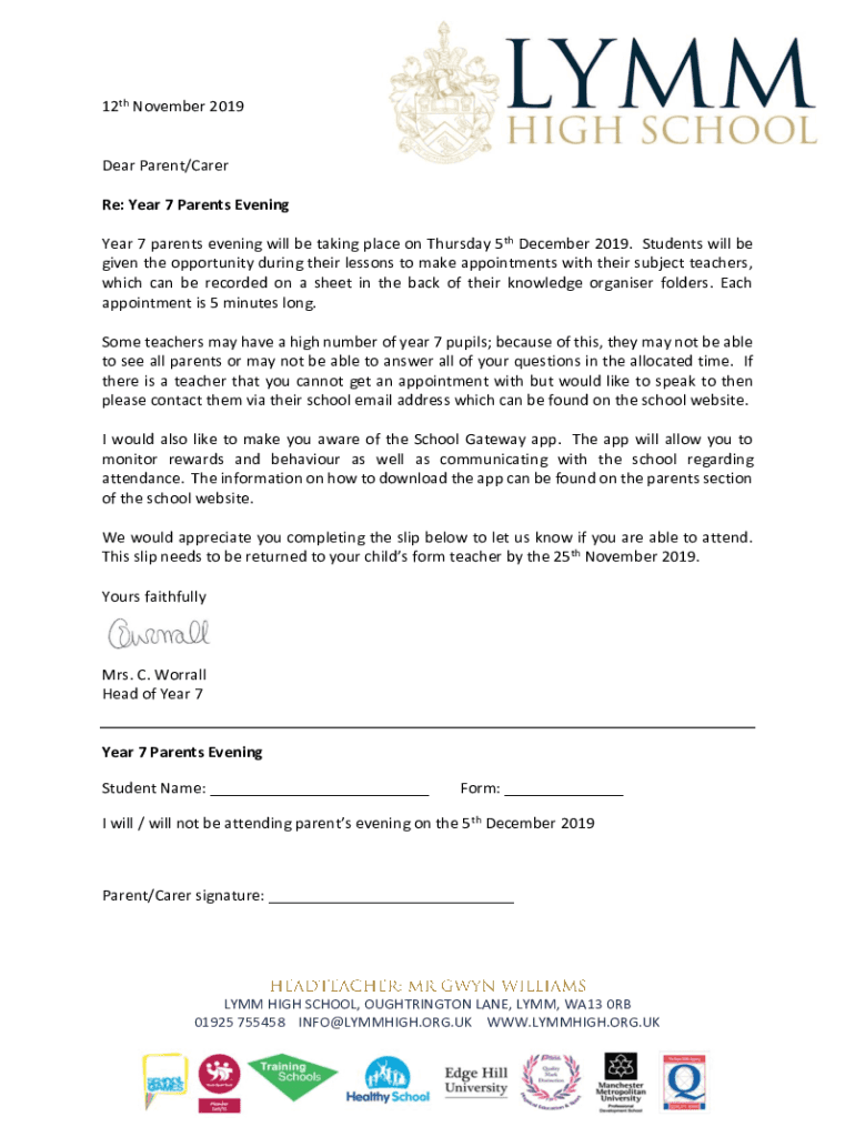 12th November 2019Dear Parent/Carer Re: Year 7 Parents Evening Year 7 parents evening will be taking place on Thursday 5th December 2019. Students will be given the opportunity during their lessons