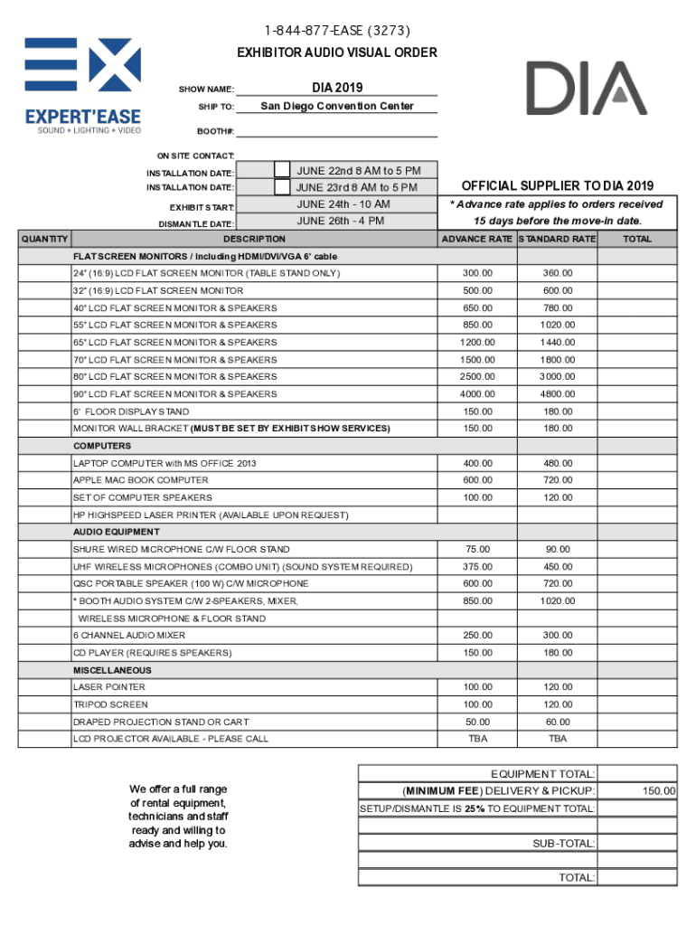 1844877EASE (3273) EXHIBITOR AUDIO VISUAL ORDER DID 2019SHOW NAME: SHIP TO:San Diego Convention Centerboard#: ON SITE CONTACT: INSTALLATION DATE: INSTALLATION DATE: JUNE 22nd 8 AM to 5 PM JUNE 23rd