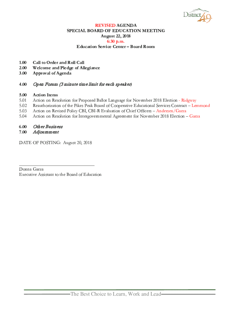 REVISED AGENDA SPECIAL BOARD OF EDUCATION MEETING August 22, 2018 6:30 p.m. Education Service Center Board Room 1.00 2.00 3.00Call to Order and Roll Call Welcome and Pledge of Allegiance Approval