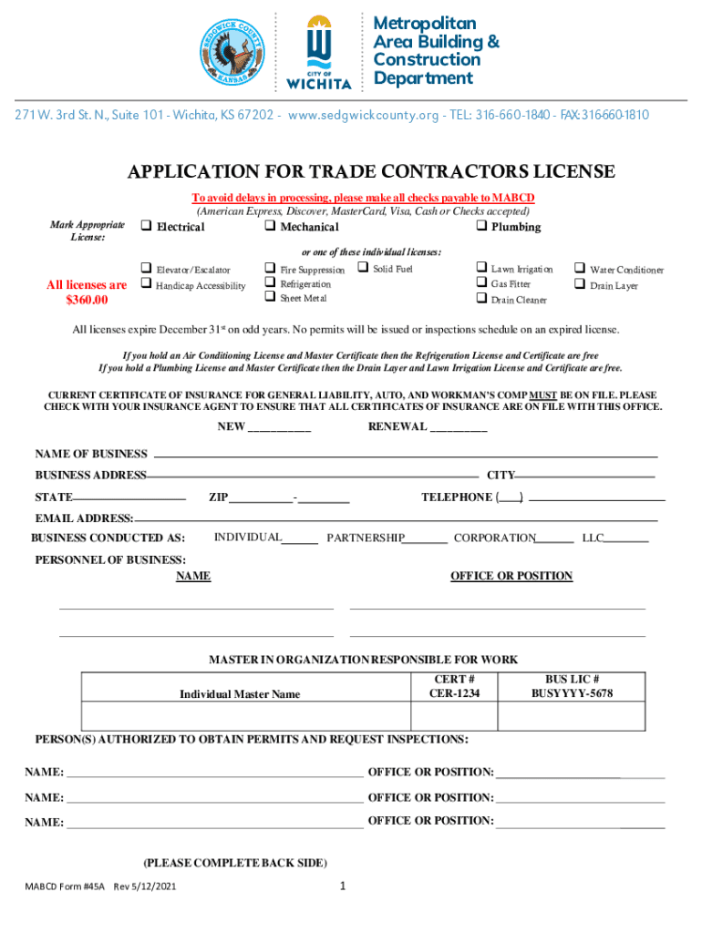 Metropolitan Area Building & Construction Department 271 W. 3rd St. N., Suite 101 Wichita, KS 67202 www.sedgwickcounty.org TEL: 3166601840 FAX: 3166601810APPLICATION FOR TRADE CONTRACTORS LICENSE