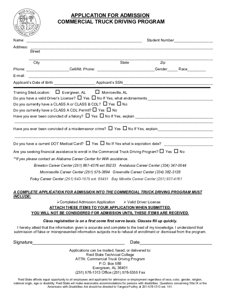 APPLICATION FOR ADMISSION COMMERCIAL TRUCK DRIVING PROGRAM Name: ___Student Number ___Address: ___ Street ___ City State Zip Phone: ___Cell/Alt. Phone: ___Gender___ Race___ Email:___Applicants Date