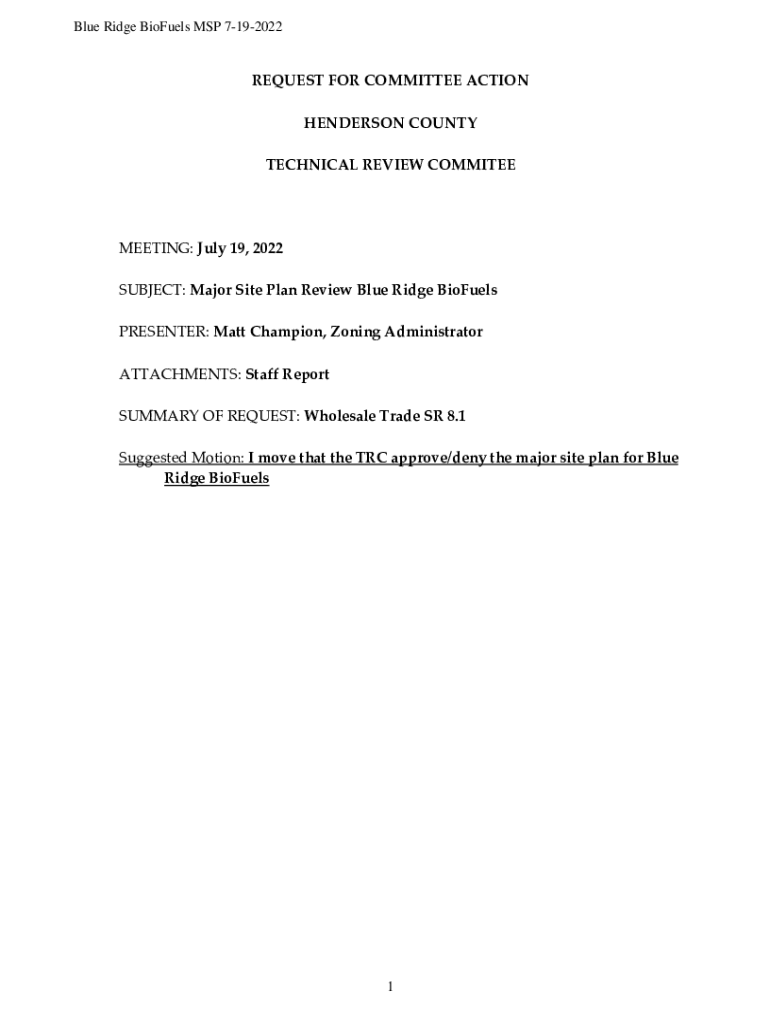 Blue Ridge BioFuels MAP 7192022REQUEST FOR COMMITTEE ACTION HENDERSON COUNTY TECHNICAL REVIEW COMMITEEMEETING: July 19, 2022, SUBJECT: Major Site Plan Review Blue Ridge BioFuels PRESENTER: Matt Champion,