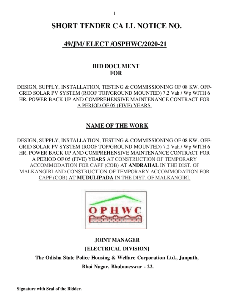 1SHORT TENDER CA LL NOTICE NO. 49/JM/ ELECT /ORPHIC/202021 BID DOCUMENT FOR DESIGN, SUPPLY, INSTALLATION, TESTING & COMMISSIONING OF 08 KW. OFF GRID SOLAR PV SYSTEM (ROOF TOP/GROUND MOUNTED) 7.2 Van