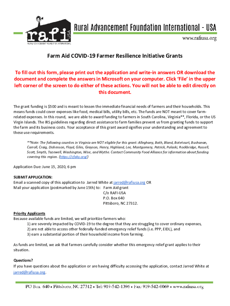 Farm Aid COVID-19 Farmer Resilience Initiative Grants To fill out this form, please print out the application and write in answers OR download the document and complete the answers in Microsoft on