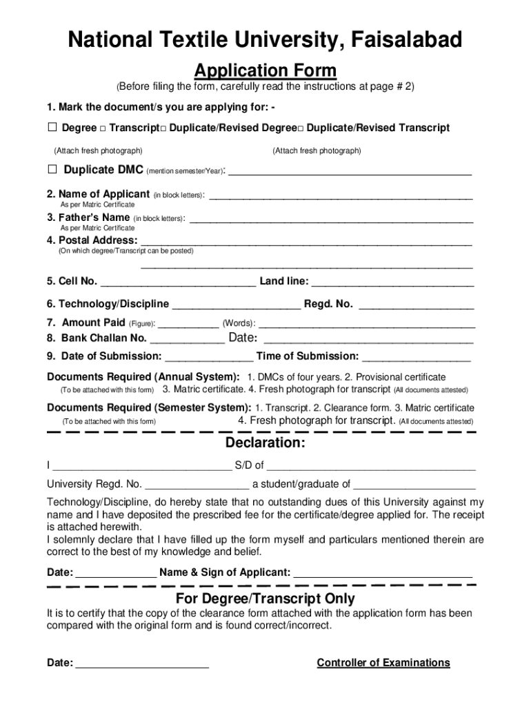 National Textile University, Faisalabad Application Form (Before filing the form, carefully read the instructions at page # 2)1. Mark the document/s you are applying for: Degree Transcript Duplicate/Revised
