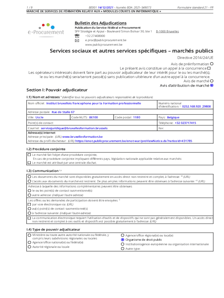 1/9 BE00114/12/2021 Humor BDA: 2021549073 MARCH DE SERVICES DE FORMATION RELATED AUX MODULES COURTS EN INFORMATIVE Formula ire standard 21 Bulletin DES Adjudications Publication du Service Feral procurement