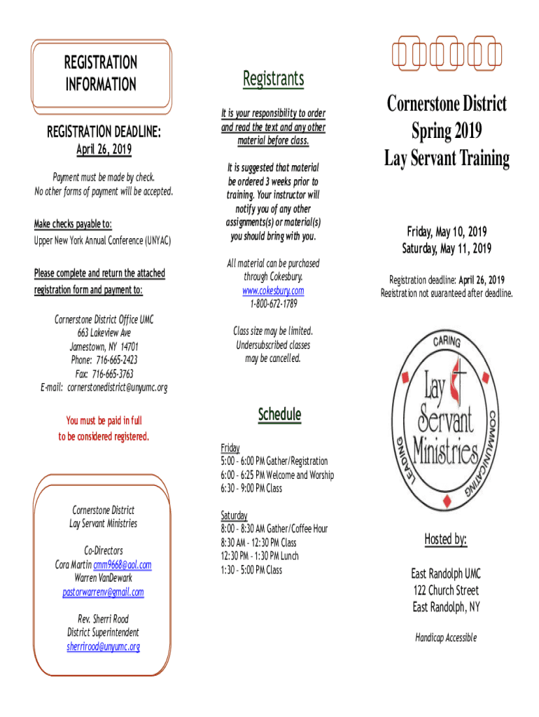 REGISTRATION INFORMATION REGISTRATION DEADLINE: April 26, 2019, Payment must be made by check. No other forms of payment will be accepted. Make checks payable to: Upper New York Annual Conference