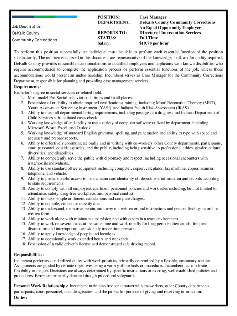 Job Description: DeKalb County Community CorrectionsPOSITION: DEPARTMENT: REPORTS TO: STATUS: Salary:Case Manager DeKalb County Community Corrections An Equal Opportunity Employer Director of Intervention