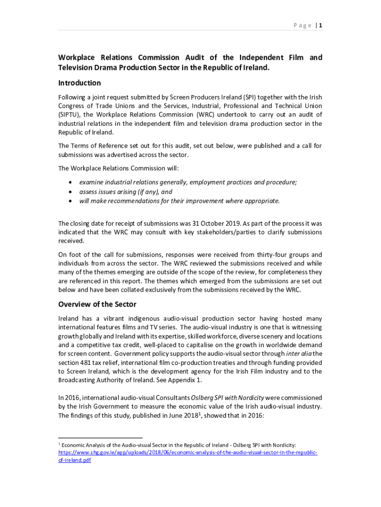 Page |1Workplace Relations Commission Audit of the Independent Film and Television Drama Production Sector in the Republic of Ireland. Introduction Following a joint request submitted by Screen Producers