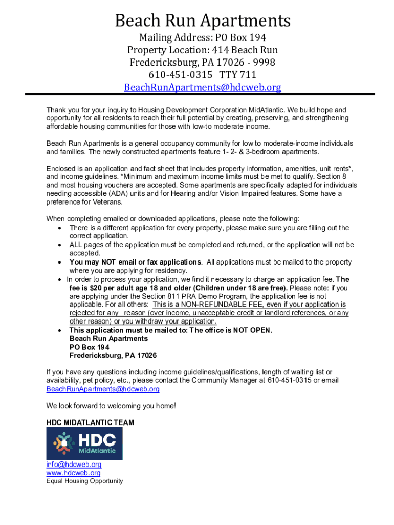 Beach Run Apartments Mailing Address: PO Box 194 Property Location: 414 Beach Run Fredericksburg, PA 17026 9998 6104510315 TTY 711 BeachRunApartments@hdcweb.orgThank you for your inquiry to Housing