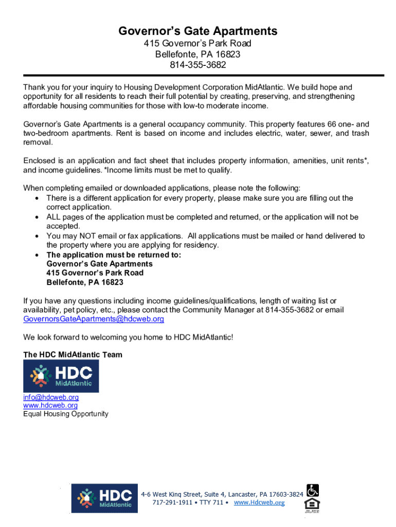 Governors Gate Apartments 415 Governors Park Road Belmonte, PA 16823 8143553682Thank you for your inquiry to Housing Development Corporation mid-Atlantic. We build hope and opportunity for all residents