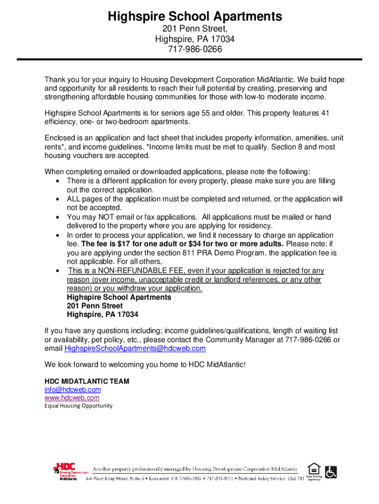 High spire School Apartments 201 Penn Street, High spire, PA 17034 7179860266Thank you for your inquiry to Housing Development Corporation mid-Atlantic. We build hope and opportunity for all residents