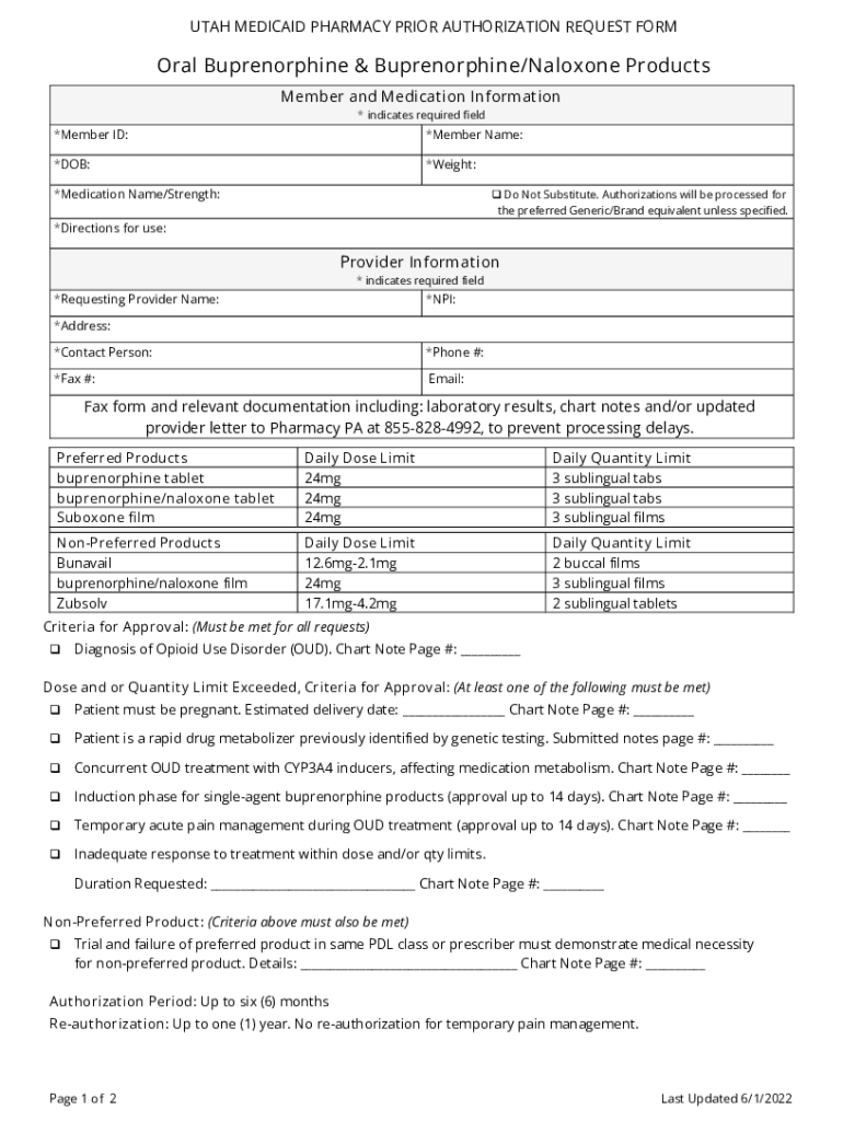 UTAH MEDICAID PHARMACY PRIOR AUTHORIZATION REQUEST Formal & /Naloxone Products Member and Medication Information * indicates required field×Member ID:*Member Name:*DOB:*Weight:*Medication Name/Strength: