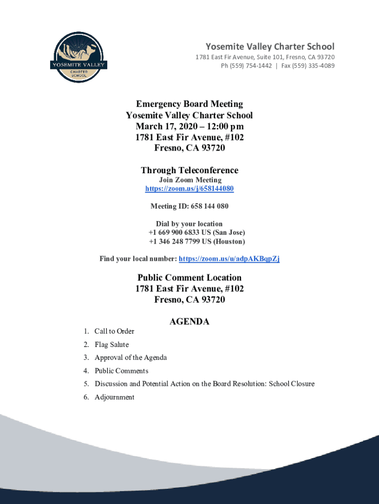Yosemite Valley Charter School1781 East Fir Avenue, Suite 101, Fresno, CA 93720 pH (559) 7541442 | Fax (559) 3354089Emergency Board Meeting Yosemite Valley Charter School March 17, 2020 12:00 pm 1781