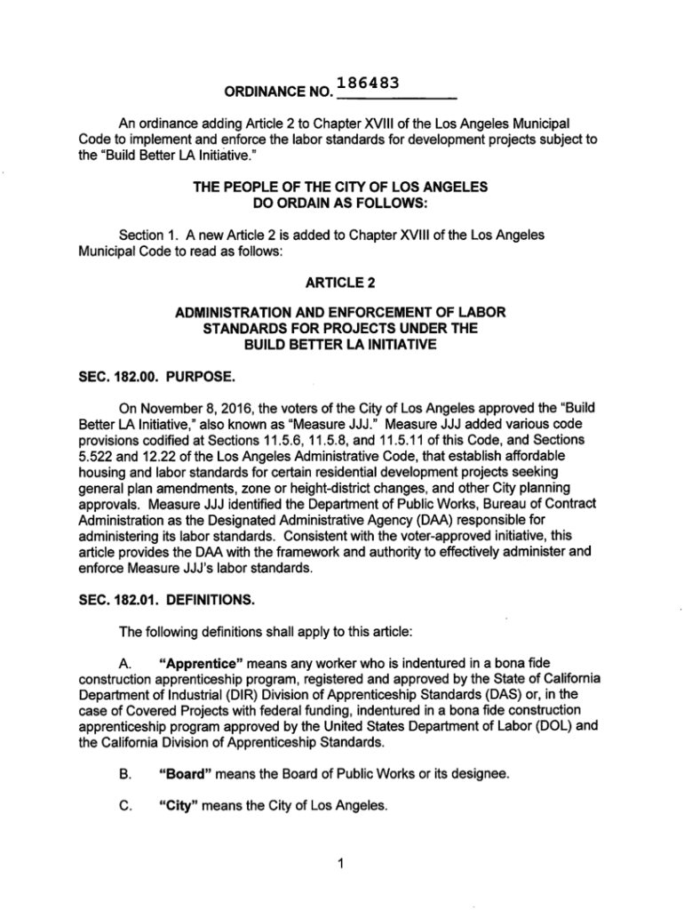 ORDINANCE NO.186483An ordinance adding Article 2 to Chapter XVIII of the Los Angeles Municipal Code to implement and enforce the labor standards for development projects subject to the Build Better