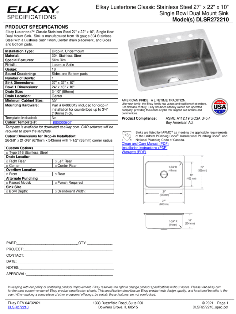 How to fill out elkay dlsr2722102 lustertone classic