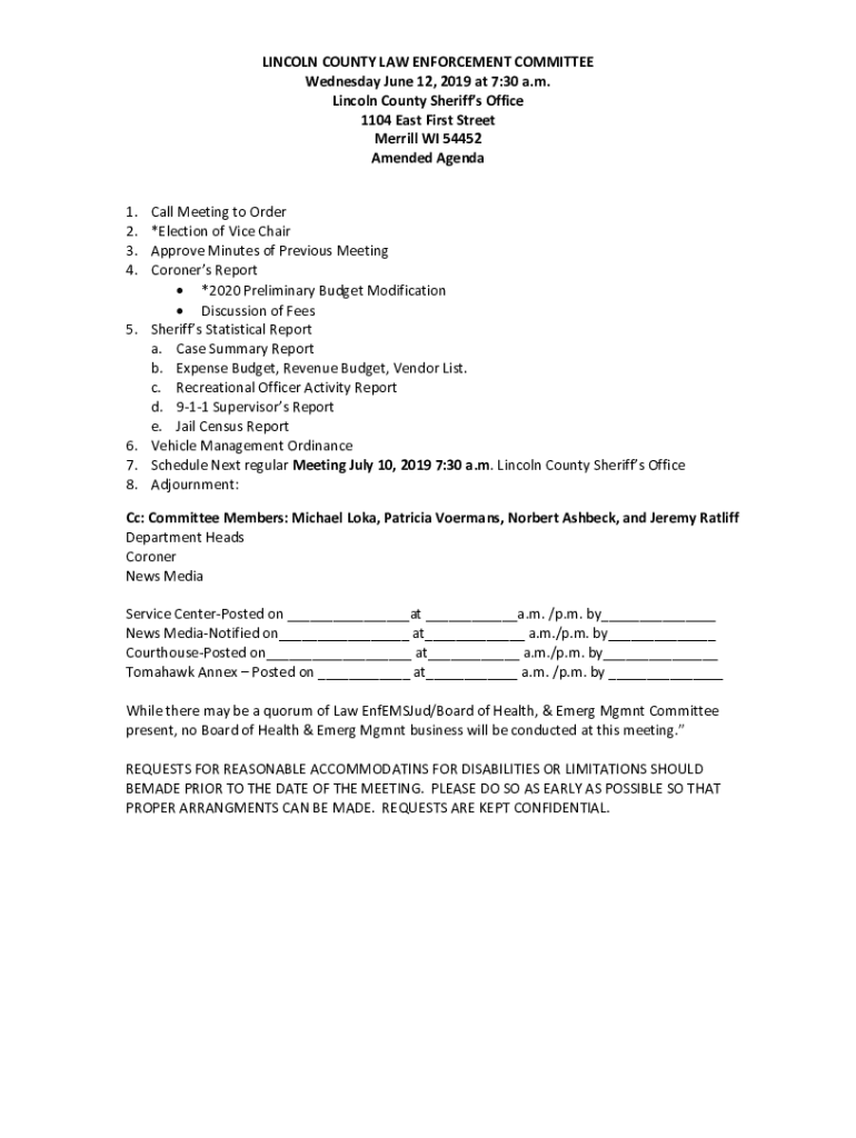 LINCOLN COUNTY LAW ENFORCEMENT COMMITTEE Wednesday, June 12, 2019, at 7:30 a.m. Lincoln County Sheriffs Office 1104 East First Street Merrill WI 54452 Amended Agenda 1. 2. 3. 4.5.6. 7. 8. Call Meeting