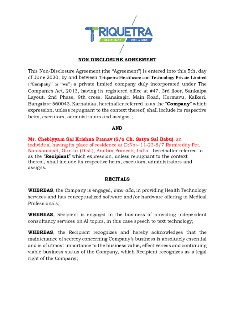 of June 2020, by and between Triquetral Healthcare and Technology Private Limited