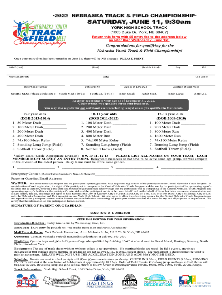 2022 NEBRASKA TRACK & FIELD CHAMPIONSHIPSATURDAY, JUNE 11, 9:30am YORK HIGH SCHOOL TRACK (1005 Duke Dr, York, NE 68467) Return this form with $5 entry fee to the address below no later than Wednesday,