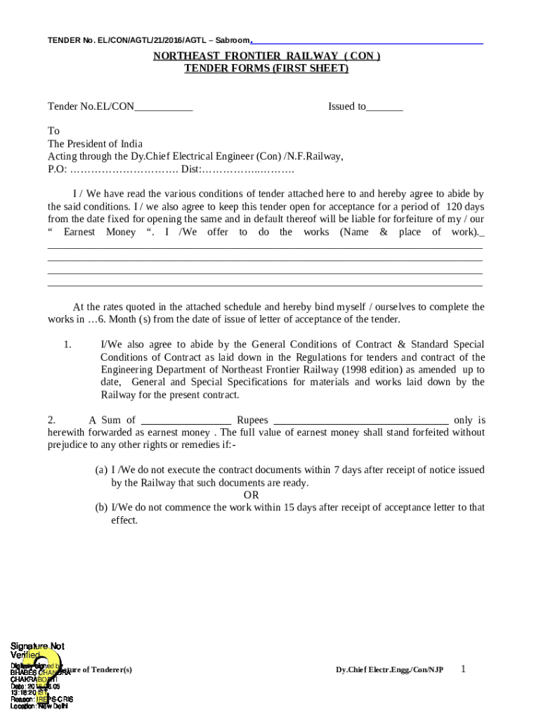 TENDER No. EL/CON/AGL/21/2016/AGL Broom. NORTHEAST FRONTIER RAILWAY (CON) TENDER FORMS (FIRST SHEET) Tender No.EL/CON___Issued to___To The President of India Acting through the Dy. Chief Electrical