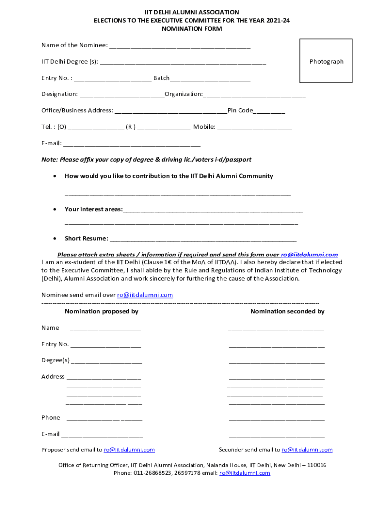 IIT DELHI ALUMNI ASSOCIATION ELECTIONS TO THE EXECUTIVE COMMITTEE FOR THE YEAR 202124 NOMINATION FORM Name of the Nominee: ___ IIT Delhi Degree (s): ___Photographer No. ___ Batch___ Designation: