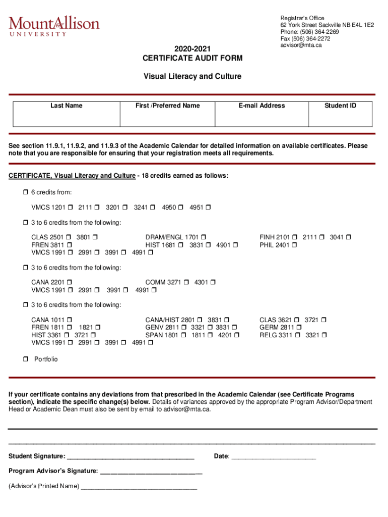 20202021 CERTIFICATE AUDIT FORMRegistrars Office 62 York Street Vacaville NB E4L 1E2 Phone: (506) 3642269 Fax (506) 3642272 advisor@mta.caVisual Literacy and Cultures NameFirst /Preferred NameEmail