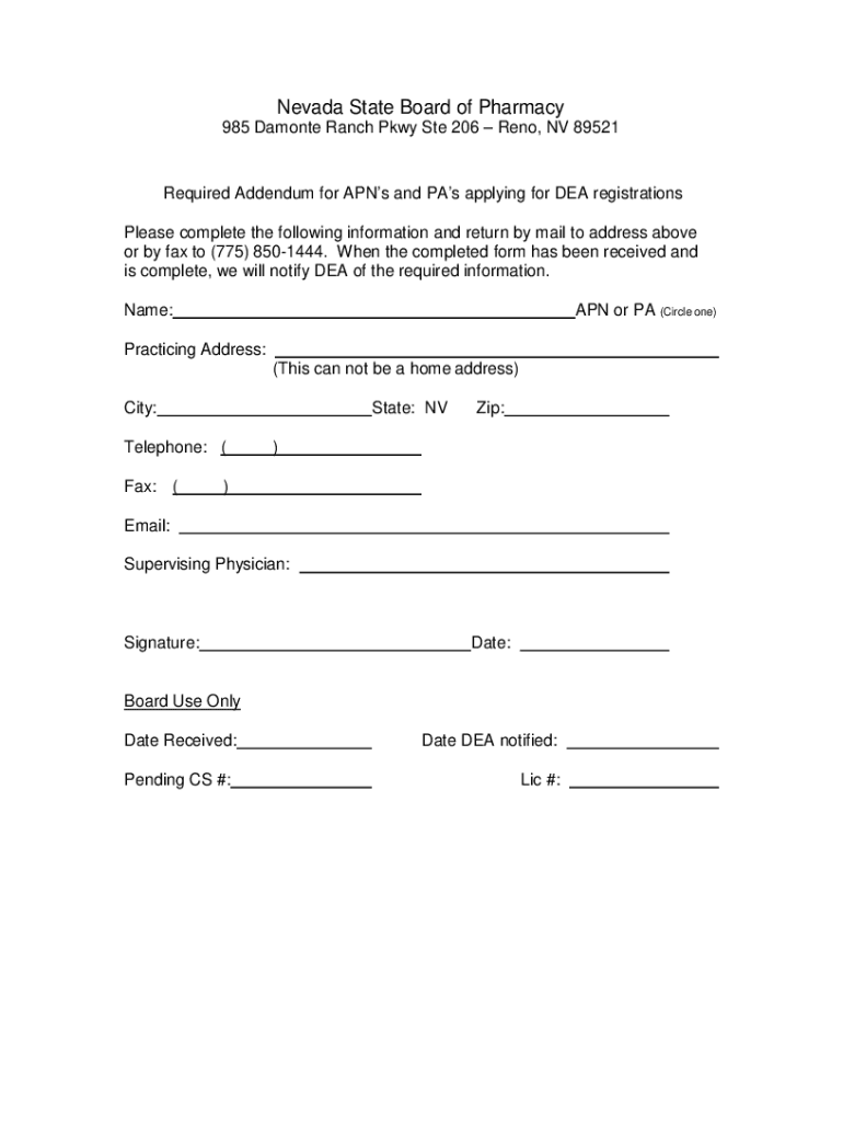 Nevada State Board of Pharmacy 985 Monte Ranch Pkwy Ste 206 Reno, NV 89521Required Addendum for APNs and PAs applying for DEA registrations Please complete the following information and return by