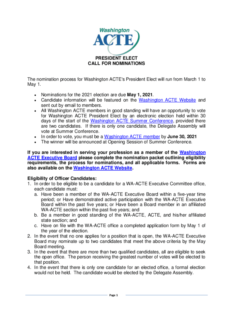 PRESIDENT-ELECT CALL FOR NOMINATIONS The nomination process for Washington ACTE\'s President-Elect will run from March 1 to May 1. Nominations for the 2021 election are due May 1, 2021. Candidate