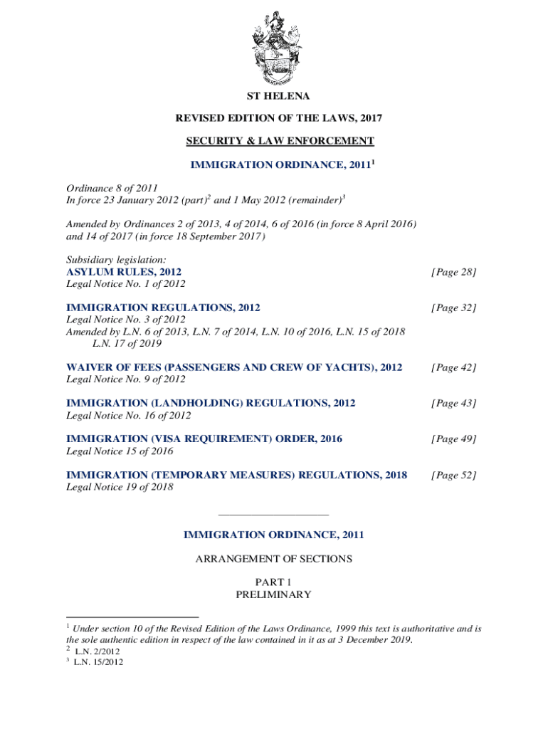 ST HELENA REVISED EDITION OF THE LAWS, 2017 SECURITY & LAW ENFORCEMENT IMMIGRATION ORDINANCE, 20111 Ordinance 8 of 2011 In force 23 January 2012 (part)2 and 1 May 2012 (remainder)3 Amended by Ordinances