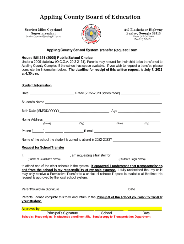 Applying County Board of Education Scarlett Miles Copeland Superintendent249 Black shear Highway Bailey, Georgia 31513Scarlett.Copeland@appling.k12.ga.usPhone (912) 3678600 Fax (912) 3671011Appling