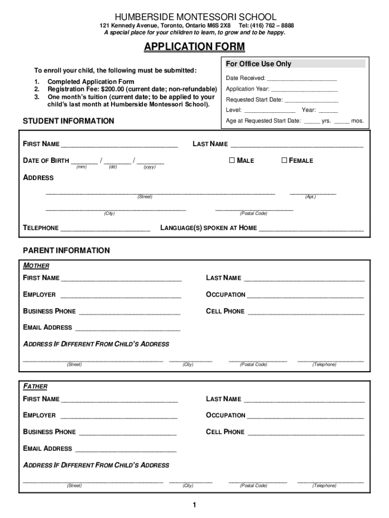 UNDERSIDE MONTESSORI SCHOOL 121 Kennedy Avenue, Toronto, Ontario M6S 2×8 Tel: (416) 762 8888 A special place for your children to learn, to grow and to be happy. APPLICATION FORM For Office Use Only