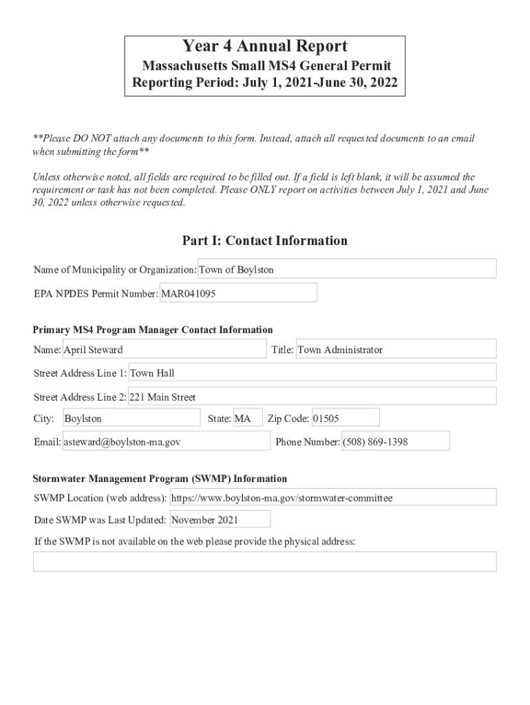 Year 4 Annual Report Massachusetts Small MS4 General Permit Reporting Period: July 1, 2021June 30, 2022**Please DO NOT attach any documents to this form. Instead, attach all requested documents to