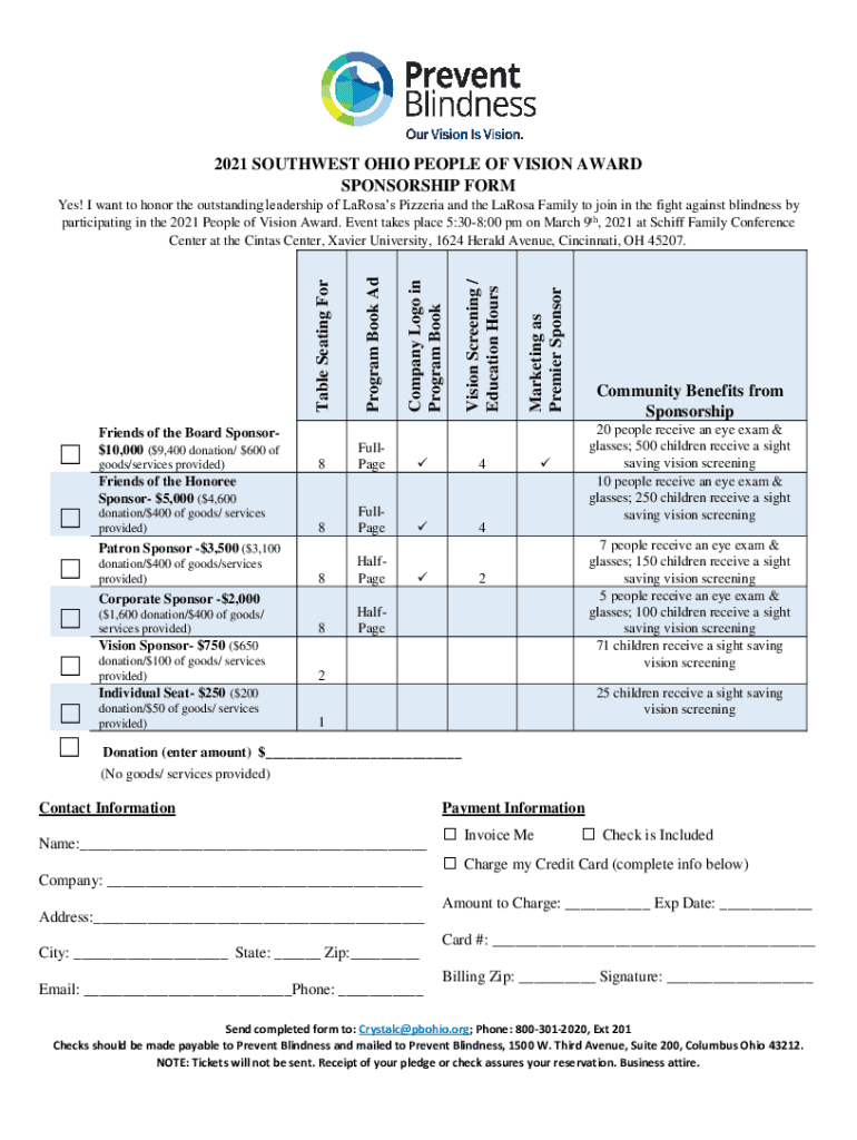 2021 SOUTHWEST OHIO PEOPLE OF VISION AWARD SPONSORSHIP FORM goods/services provided)4donation/$400 of goods/ services provided)8FullPage48HalfPage8HalfPageMarketing as Premier Sponsor Friends of the