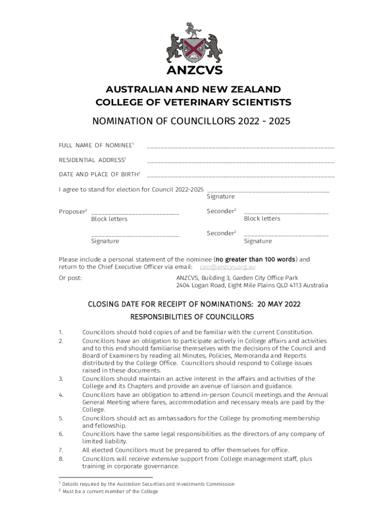 AUSTRALIAN AND NEW ZEALAND COLLEGE OF VETERINARY SCIENTISTSNOMINATION OF COUNCILLORS 2022 2025 FULL NAME OF NOMINEE1___RESIDENTIAL ADDRESS1___DATE AND PLACE OF BIRTH1___I agree to stand for election