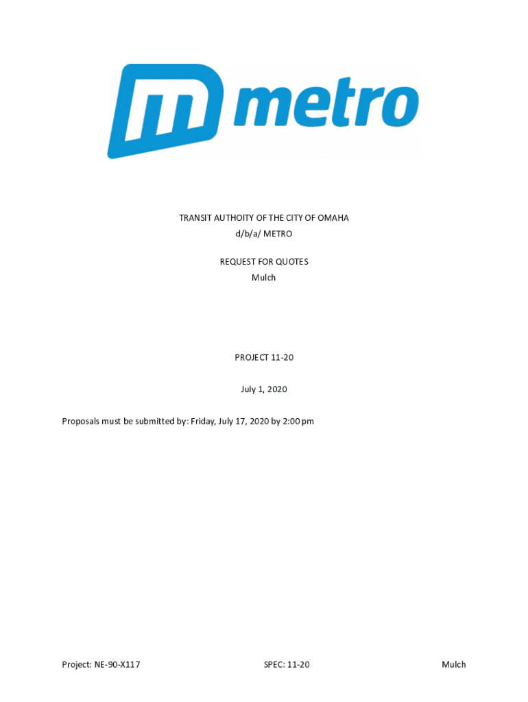 TRANSIT AUTHORITY OF THE CITY OF OMAHA d/b/a/ METRO REQUEST FOR QUOTES MulchPROJECT 1120 July 1, 2020, Proposals must be submitted by: Friday, July 17, 2020, by 2:00 project: NE90X117SPEC: 1120MulchSolicitation