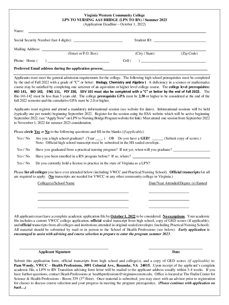 Virginia Western Community College LPN TO NURSING AAS BRIDGE (LPN TO RN) / Summer 2023 (Application Deadline October 1, 2022) Name: Social Security Number (last 4 digits):Student ID:Mailing Address: