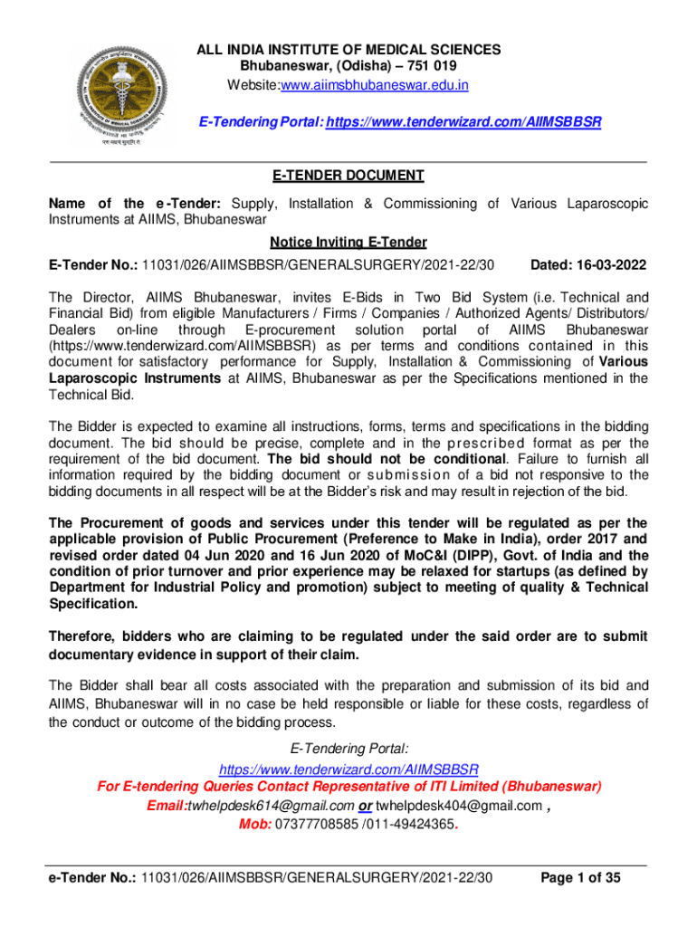 ALL INDIA INSTITUTE OF MEDICAL SCIENCES Bhubaneswar, (Odisha) 751 019 Website:www.aiimsbhubaneswar.edu.in Tendering Portal: https://www.tenderwizard.com/AIIMSBBSRETENDER DOCUMENT Name of the e Tender: