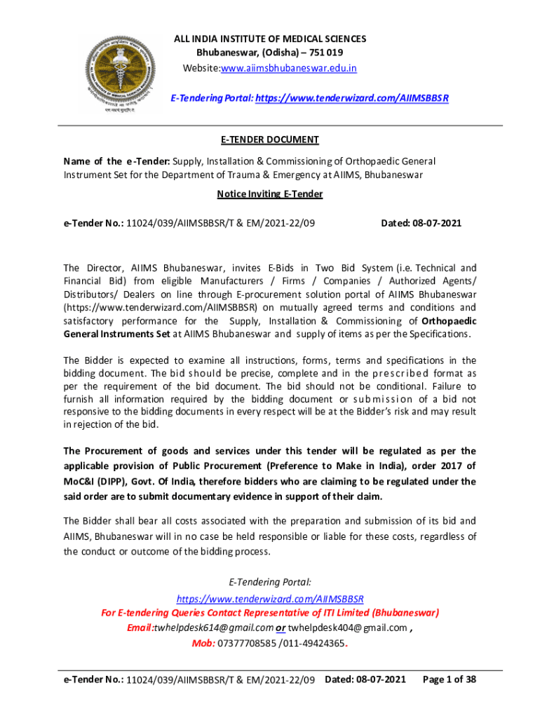 ALL INDIA INSTITUTE OF MEDICAL SCIENCES Bhubaneswar, (Odisha) 751 019 Website:www.aiimsbhubaneswar.edu.in Tendering Portal: https://www.tenderwizard.com/AIIMSBBSRETENDER DOCUMENT Name of the e Tender: