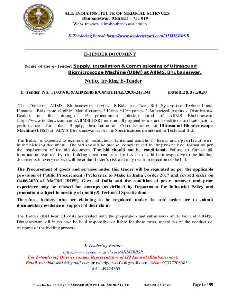 ALL INDIA INSTITUTE OF MEDICAL SCIENCES Bhubaneswar, (Odisha) 751 019 Website:www.aiimsbhubaneswar.edu.in Tendering Portal: https://www.tenderwizard.com/AIIMSBBSRETENDER DOCUMENT Name of the e Tender: