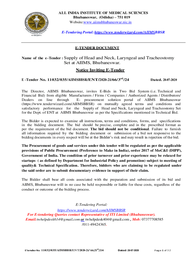 ALL INDIA INSTITUTE OF MEDICAL SCIENCES Bhubaneswar, (Odisha) 751 019 Website:www.aiimsbhubaneswar.nic.in Tendering Portal: https://www.tenderwizard.com/AIIMSBBSRETENDER DOCUMENT Name of the e Tender