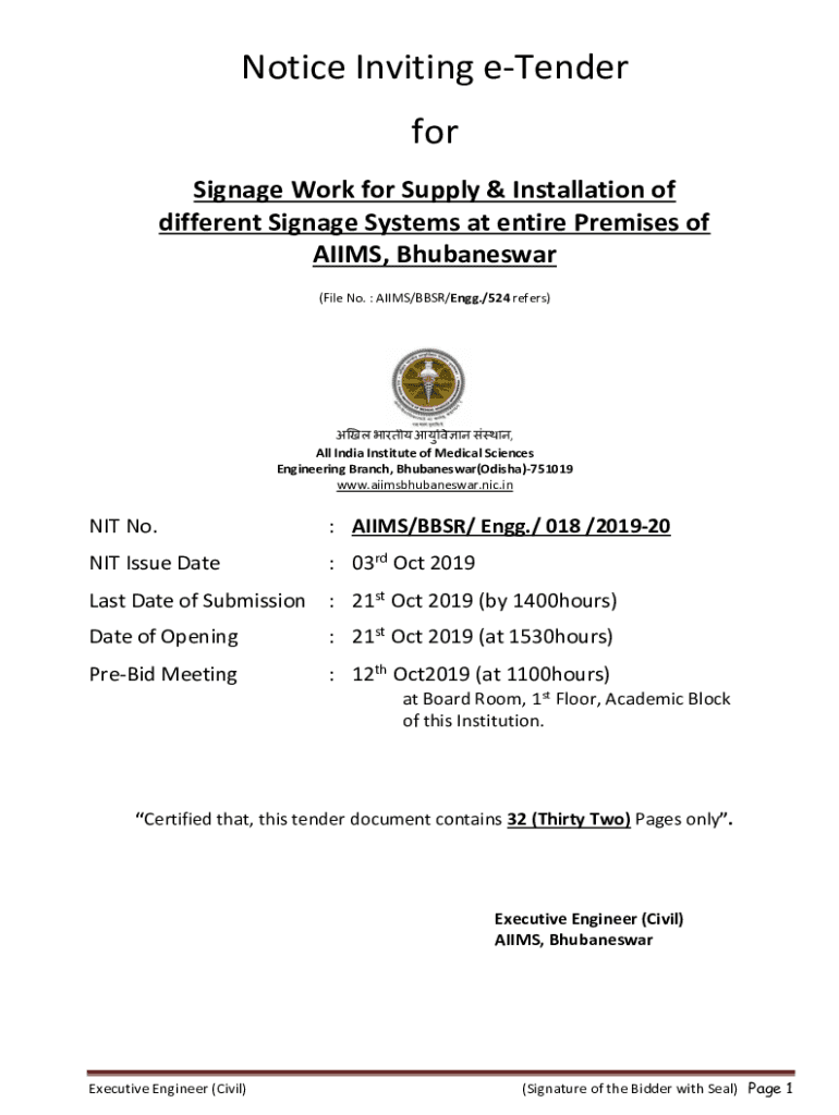Notice Inviting tender for Signage Work for Supply & Installation of different Signage Systems at entire Premises of AIMS, Bhubaneswar (File No. AIMS/BBS/Egg./524 refers), All India Institute of Medical