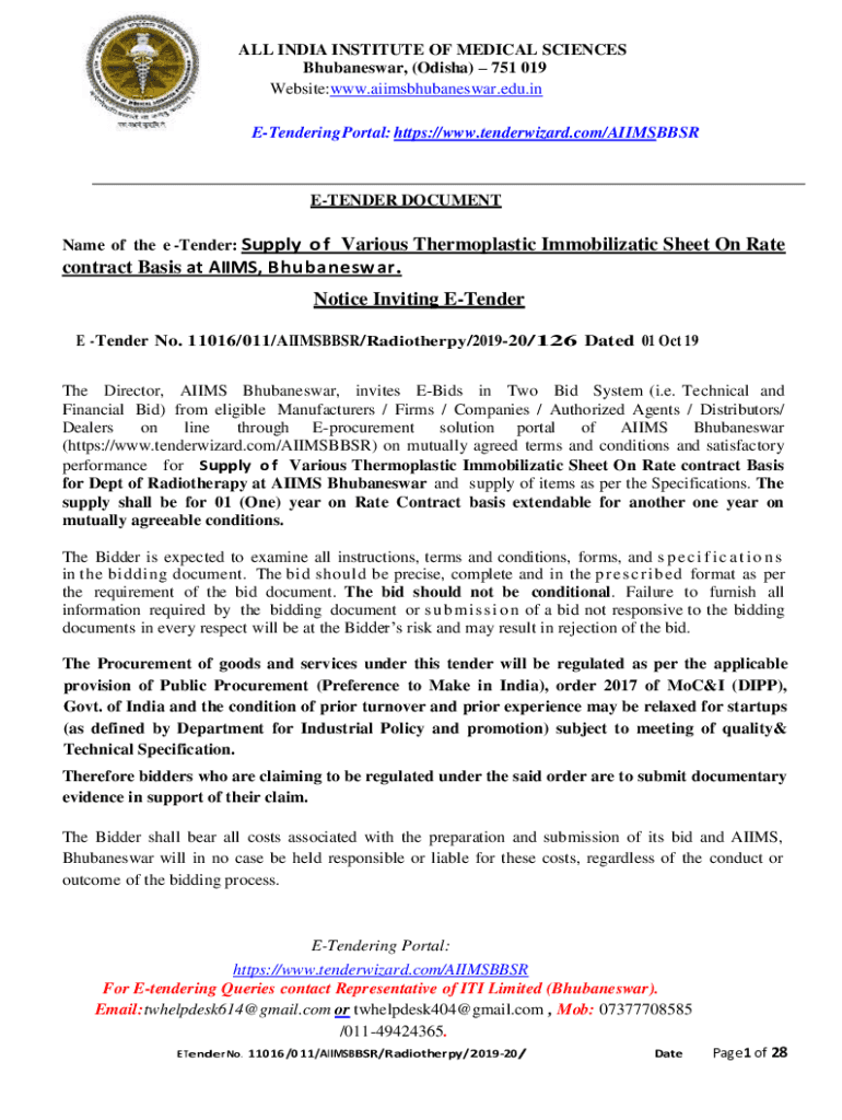 ALL INDIA INSTITUTE OF MEDICAL SCIENCES Bhubaneswar, (Odisha) 751 019 Website:www.aiimsbhubaneswar.edu.in Tendering Portal: https://www.tenderwizard.com/AIIMSBBSRETENDER DOCUMENT Name of the e Tender: