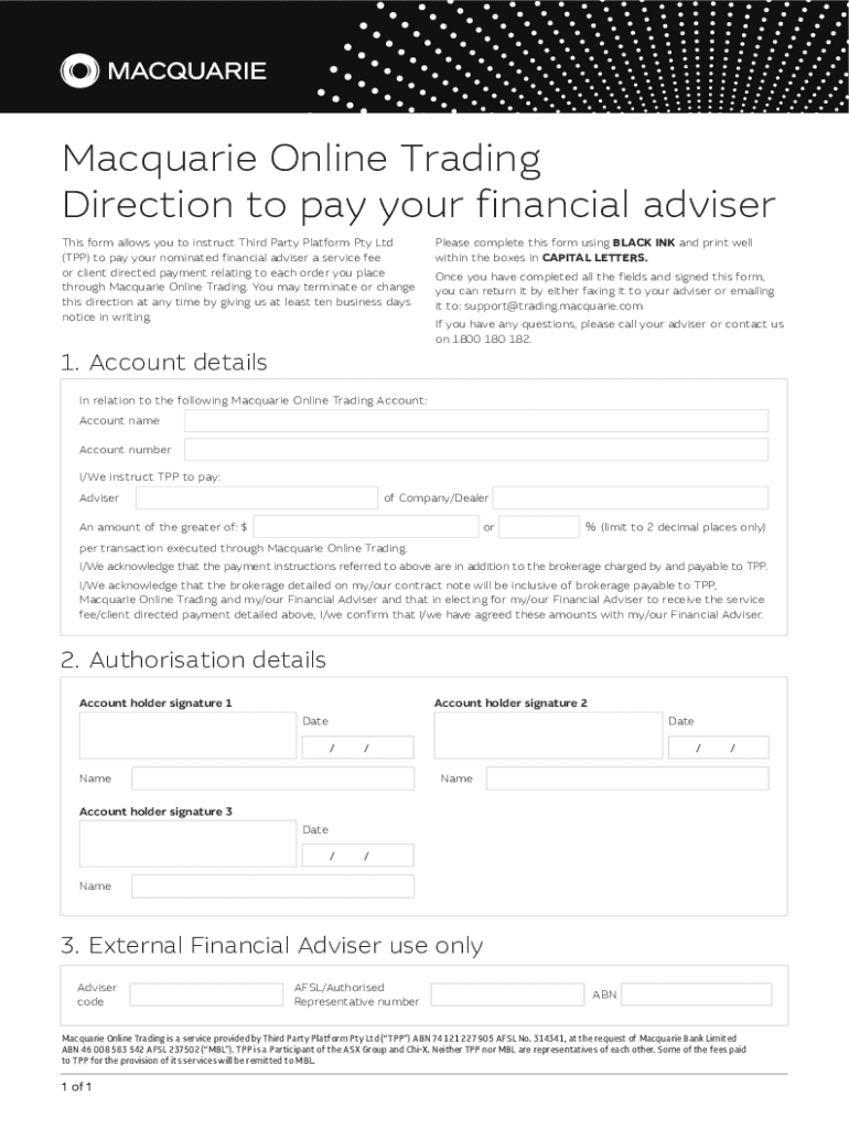 Macquarie Online Trading Direction to pay your financial adviser This form allows you to instruct Third Party Platform Pty Ltd (TPP) to pay your nominated financial adviser a service fee or client