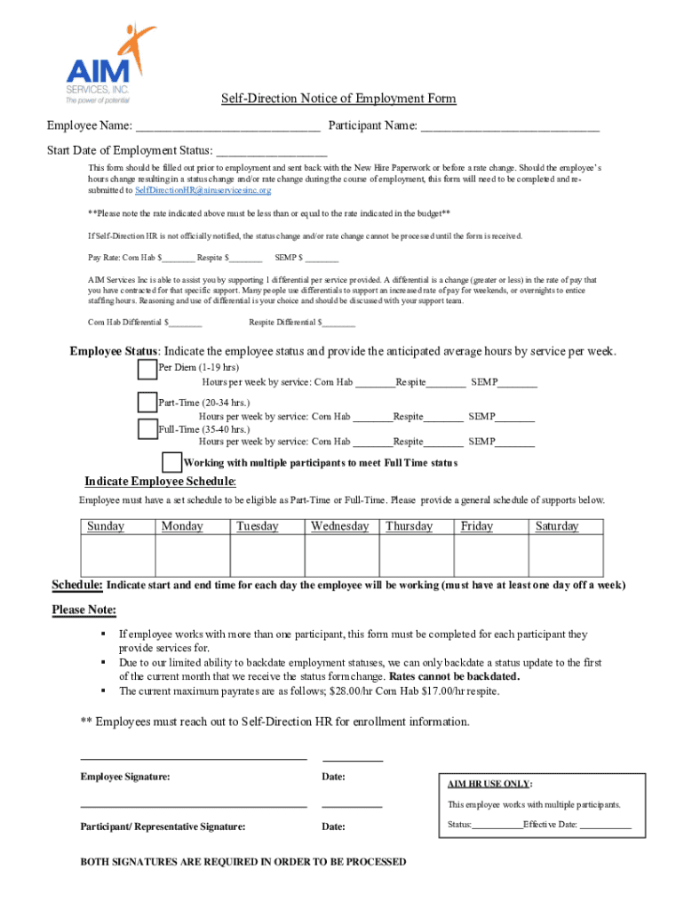 Get the free Self-Direction Notice of Employment Form - AIM Services