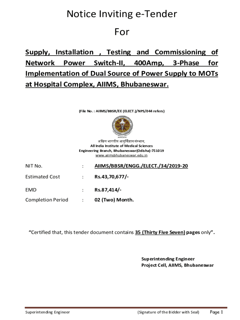 Notice Inviting tender Supply, Installation, Testing and Commissioning of Network Power Switch, 400Amp, 3Phase for Implementation of Dual Source of Power Supply to Mots at Hospital Complex, AIMS,