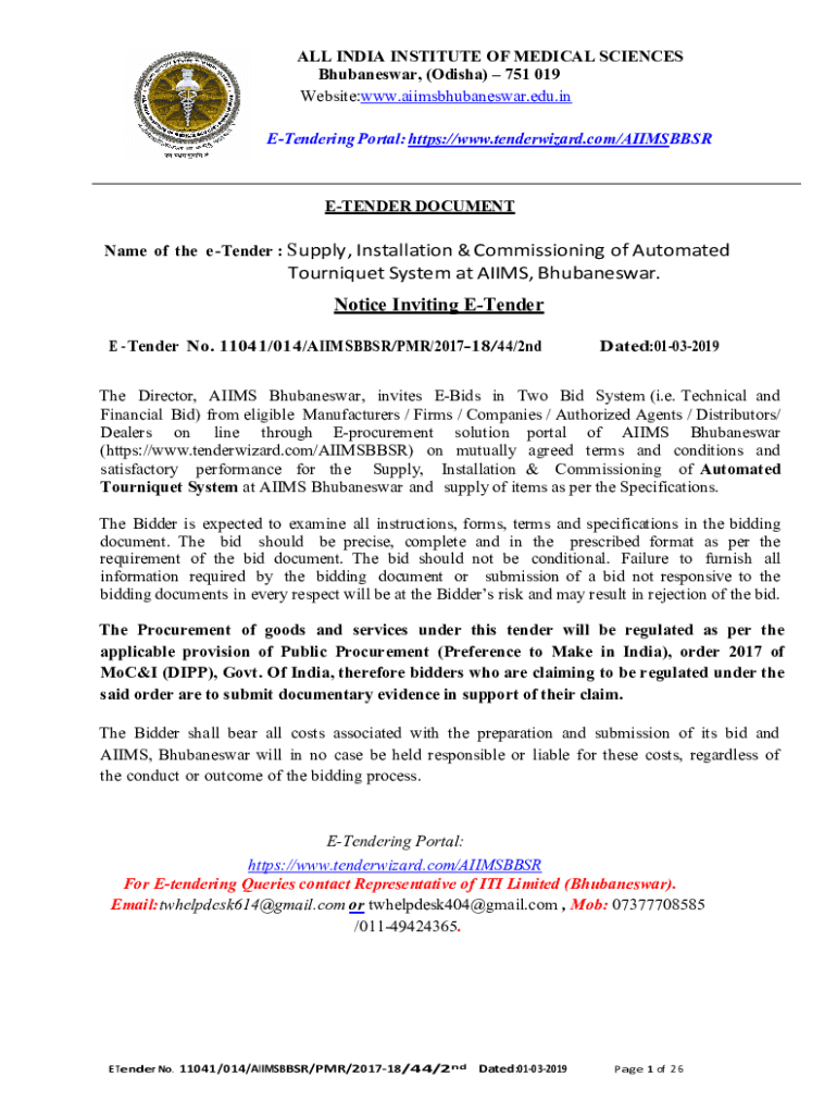 ALL INDIA INSTITUTE OF MEDICAL SCIENCES Bhubaneswar, (Odisha) 751 019 Website:www.aiimsbhubaneswar.edu.in Tendering Portal: https://www.tenderwizard.com/AIIMSBBSR TENDER DOCUMENT Name of the e Tender